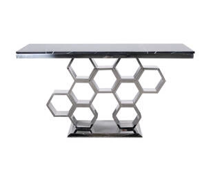 Elegancka i nowoczesna chromowana konsola z czarnym blatem imitującym marmur. Blat ma długość 150 cm. Podstawa w kształcie plastrów miodu. Stylistyka glamour.