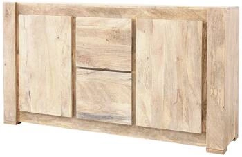 Szeroka komoda indyjska z litego drewna mango w kolorze naturalnym. 2 szuflady i 2 szafki z półkami, ręczne wykonanie, kolonialny styl. Pojemny, elegancki mebel do salonu i sypialni.