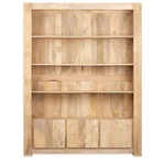 Elegancki regał z litego drewna mango w naturalnym kolorze, z półkami i dwiema szufladami. Przeszklone boki nadają lekkości, a minimalistyczna forma czyni go idealnym wyborem do każdego wnętrza.