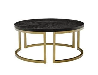 Elegancja na najwyższym poziomie. Okrągły stolik kawowy z drewna bukowego i dębowego, z czarnym blatem w połysku i intarsją oraz złotymi nogami. Idealny wybór do salonu w stylu glamour i nowoczesnym.