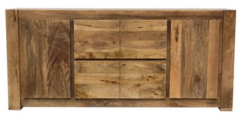 Szeroka komoda indyjska z litego drewna mango w kolorze naturalnym. 2 szuflady i 2 szafki z półkami, ręczne wykonanie, kolonialny styl. Pojemny, elegancki mebel do salonu i sypialni.