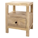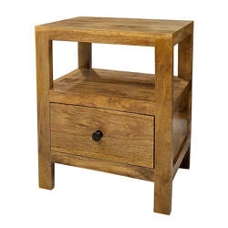 Stylowa szafka nocna z drewna mango w kolorze naturalnym, z szufladą i półką. Doskonała do wnętrz inspirowanych naturą – jej wyjątkowa struktura i delikatny kolor wprowadzą harmonię i przytulność.
