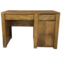 Praktyczne i eleganckie biurko z litego drewna mango w kolorze ciepłego brązu. Obszerne szuflady i zamykana szafka gwarantują wygodę pracy i porządek w gabinecie.