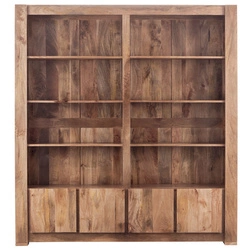 Duży regał drewniany 180 cm z litego mango w kolorze toffi. 4 półki, 2 szafki, minimalistyczny design, trwała konstrukcja. Idealny do salonu, gabinetu i biura. Styl kolonialny, nowoczesny.