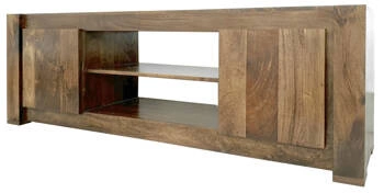 Elegancka i funkcjonalna komoda RTV z litego drewna mango w ciepłym odcieniu toffi. Wyposażona w otwartą wnękę z półkami i dwie zamknięte szafki, stanowi idealne rozwiązanie do przechowywania sprzętu i akcesoriów RTV.