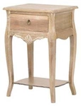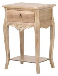 Stylowa szafka nocna w stylu rustykalnym, z bielonego drewna paulowni i topoli. Przecierana powierzchnia, gięte nóżki, rzeźbienia i metalowe uchwyty vintage. Szufladka i półka zapewniają funkcjonalność i francuski klimat sypialni.
