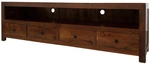 Drewniana szafka RTV 200 cm z litego mango. Półka na sprzęt RTV, 4 szuflady i otwory na kable. Nowoczesny design, minimalistyczna forma i ciepły brązowy odcień. Idealna do dużych wnętrz w stylu loftowym, skandynawskim i industrialnym!