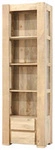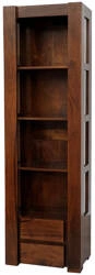 Stylowy i funkcjonalny wąski regał na książki z litego drewna mango w ciepłym brązowym odcieniu. Przeszklone boki i dwie praktyczne szuflady czynią go idealnym wyborem do każdego wnętrza.