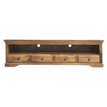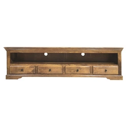 Komoda RTV kolonialna 200 cm z litego drewna mango. Styl klasyczny i rustykalny, 4 szuflady, szeroka półka na sprzęt, ręcznie zdobiona stopa. Naturalny brąz toffi, lakier satynowy – elegancja i funkcjonalność!