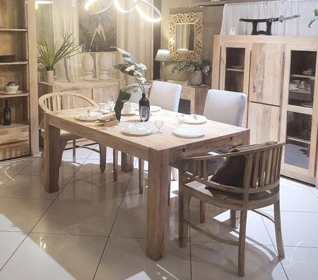 Indyjski, drewniany stół w stylu skandynawskim - wykonany z egzotycznego drewna mangowca. Grube nogi i solidne deski to cechy tej kolekcji. Profile nóg widoczne z góry, na blacie co podkreśla nowoczesny design tego stołu. Grube profile i dodatkowe dostawki sprawiają, że można powiększyć. Elegancki kolonialny stół indyjski doskonale pasuje do nowoczesnych aranżacji.