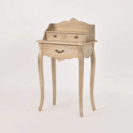 - Stylowy sekretarzyk w stylu prowansalskim. Bielone drewno paulowni, delikatne przetarcia, rzeźbienia, 3 szuflady i półka. Lekka forma, gięte nóżki i uchwyty vintage. Idealna konsola do sypialni, holu lub salonu.
