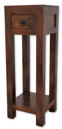 Szafka kwietnik - z kolekcji mebli kolonialnych, Szafka wykonana z mango lub akacji indyjskiej, posiada szufladkę z metalowym okrągłym uchwytem,który jest charakterystyczny dla mebli indyjskich, oraz półkę w dolnej części. Szafka może być wykorzystana jako pomocnik pod lampkę, telefon, dodatkowo może służyć jako kwietnik. Całość w kolorze ciemnego brązu, który wspaniale podkreśla piękno litego drewna.