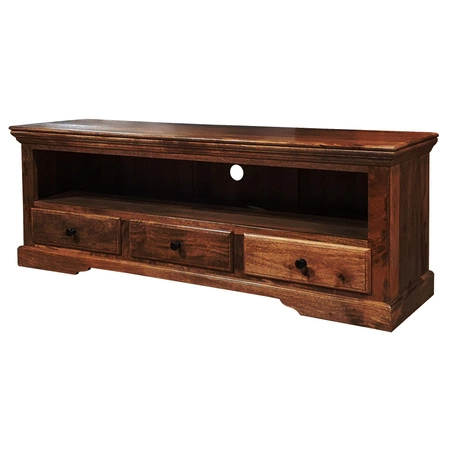 - Szafka RTV kolonialna 150 cm z litego drewna akacji indyjskiej. Posiada 4 szuflady, szeroką półkę na sprzęt RTV i otwór na kable. Eleganckie frezy i klasyczny design sprawiają, że doskonale pasuje do wnętrz w stylu kolonialnym.