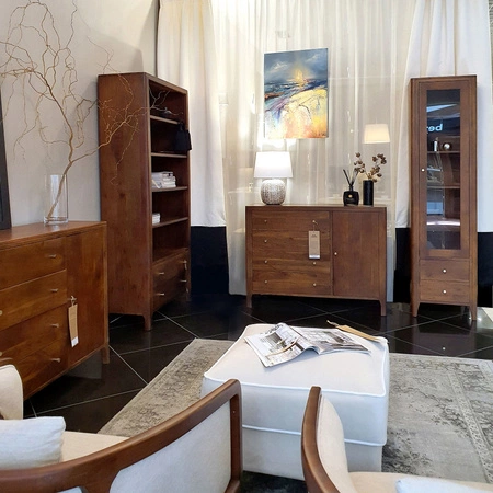 Witryna została zaprojektowana z myślą o kompaktowych przestrzeniach – jej szerokość 50 cm pozwala ustawić ją nawet w niewielkim salonie, jadalni, gabinecie czy pokoju młodzieżowym. Przeszklone drzwiczki z cichym domykiem (soft-close) eksponują zawartość – książki, dekoracje, szkło lub kolekcje – dodając wnętrzu głębi i klasy.