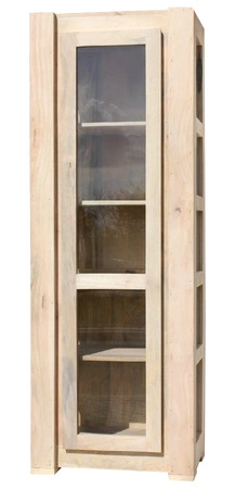 - Wąska witryna drewniana przeszklona 66 cm z litego mango. Przeszklone boki i drzwi, drewniane półki, subtelne frezowania. Stylowy i funkcjonalny mebel do salonu, jadalni i gabinetu.